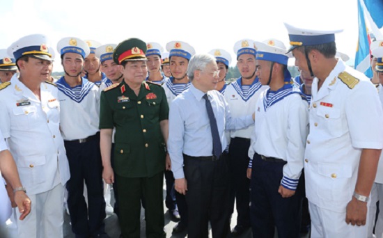 Tổng Bí thư Nguyễn Phú Trọng với cán bộ, chỉ huy và chiến sĩ trên Tàu hộ vệ tên lửa Lý Thái Tổ - Ảnh: Báo Người đại biểu Nhân dân