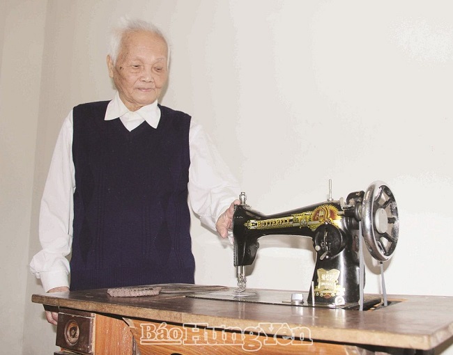 Anh hùng Lao động thời kỳ đổi mới Cao Văn Hoành bên chiếc máy may thủ công