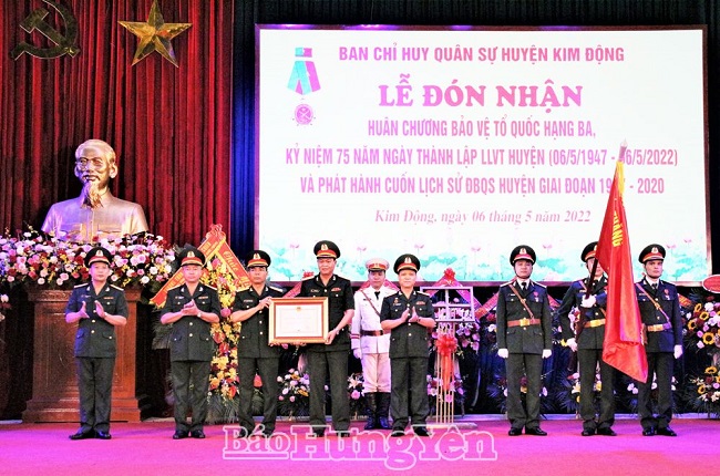 Ngày 6.5, Ban Chỉ huy Quân sự huyện Kim Động tổ chức lễ đón nhận Huân chương Bảo vệ Tổ quốc hạng Ba; kỷ niệm 75 năm Ngày thành lập lực lượng vũ trang (LLVT) huyện (6.5.1947 - 6.5.2022) và phát hành cuốn Lịch sử Đảng bộ Quân sự huyện Kim Động giai đoạn 1947 - 2020. Dự buổi lễ có các đồng chí: Nguyễn Văn Cường, nguyên Bí thư Tỉnh uỷ; các đồng chí Uỷ viên Ban Thường vụ Tỉnh uỷ: Nguyễn Lê Huy, Trưởng ban Nội chính Tỉnh uỷ; Đại tá Nguyễn Chí Công, Chỉ huy trưởng Bộ Chỉ huy Quân sự tỉnh; Phạm Huy Bình, Bí thư Thành uỷ Hưng Yên; đồng chí Nguyễn Hùng Nam, Phó Chủ tịch UBND tỉnh; Anh hùng Lực lượng vũ trang nhân dân, Anh hùng Lao động, Bà mẹ Việt Nam anh hùng...