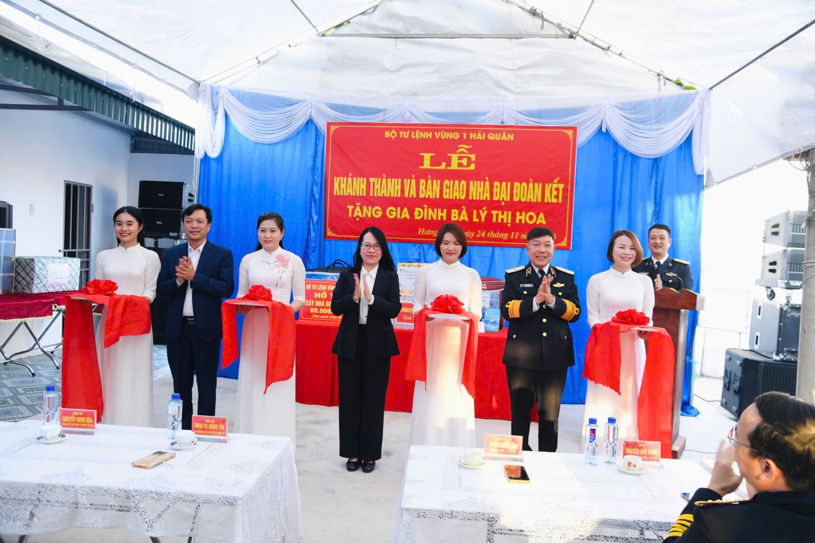 Lãnh đạo Ban Tuyên giáo và Dân vận Tỉnh uỷ cùng lãnh đạo Vùng 1 Hải quân, lãnh đạo xã Đông Tiền Hải cắt băng khánh thành và bàn giao nhà Đại đoàn kết tặng gia đình bà Lý Thị Hoa.