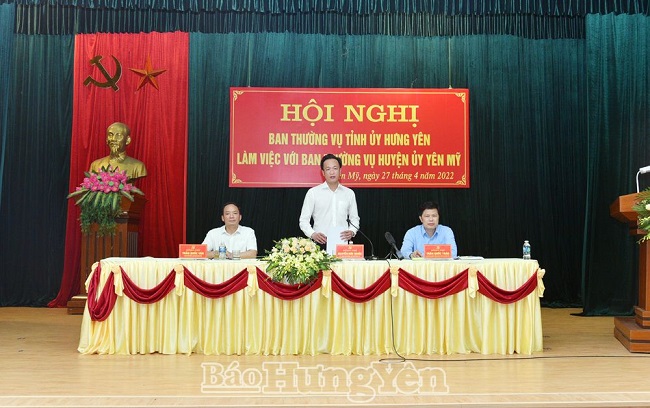 Ngày 27.4, Ban Thường vụ Tỉnh ủy làm việc với Ban Thường vụ huyện ủy Yên Mỹ về tình hình công tác xây dựng Đảng, hệ thống chính trị năm 2021 và phát triển kinh tế - xã hội, bảo đảm quốc phòng, an ninh những tháng đầu năm 2022, phương hướng, nhiệm vụ các tháng cuối năm 2022. Dự buổi làm việc có các đồng chí Nguyễn Hữu Nghĩa, Ủy viên BCH Trung ương Đảng, Bí thư Tỉnh ủy; Trần Quốc Toản, Phó Bí thư Thường trực Tỉnh ủy, Chủ tịch HĐND tỉnh; Trần Quốc Văn, Phó Bí thư Tỉnh ủy, Chủ tịch UBND tỉnh. Cùng dự có các đồng chí trong Ban Thường vụ Tỉnh ủy; Thường trực HĐND tỉnh, lãnh đạo UBND tỉnh; đại diện lãnh đạo một số sở, ngành của tỉnh…