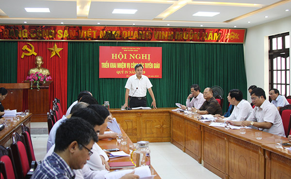Ngày 04/10/2019, Ban Tuyên giáo Tỉnh ủy Hưng Yên tổ chức Hội nghị triển khai nhiệm vụ công tác Tuyên giáo quý IV năm 2019. Đồng chí Đỗ Hữu Nhân, Phó Trưởng ban Thường trực Ban Tuyên giáo Tỉnh ủy chủ trì Hội nghị. Cùng dự có lãnh đạo Ban Tuyên giáo Tỉnh ủy; đại diện lãnh đạo các sở, ngành, hội thuộc khối khoa giáo, Báo Hưng Yên, Đài Phát thanh - Truyền hình tỉnh, Tạp chí Phố Hiến, Ban Tuyên giáo (Tuyên huấn, Phòng Công tác Đảng và Công tác chính trị) các huyện ủy, thị ủy, thành ủy, đảng ủy trực thuộc Tỉnh ủy, Trung tâm bồi dưỡng chính trị các huyện, thị xã, thành phố...