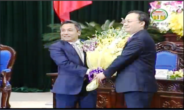 Thay mặt HĐND tỉnh, đồng chí Đỗ Tiến Sỹ, Bí thư Tỉnh ủy, Chủ tịch HĐND tỉnh tặng hoa cảm ơn những đóng góp của đồng chí Doãn Thế Cường, nguyên Chủ tịch UBND tỉnh nhiệm kỳ 2011 - 2016