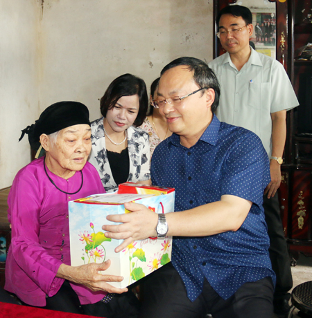 Bí thư Tỉnh ủy Đỗ Tiến Sỹ tặng quà Bà mẹ Việt Nam anh hùng Vũ Thị Bống ở xã Đình Cao