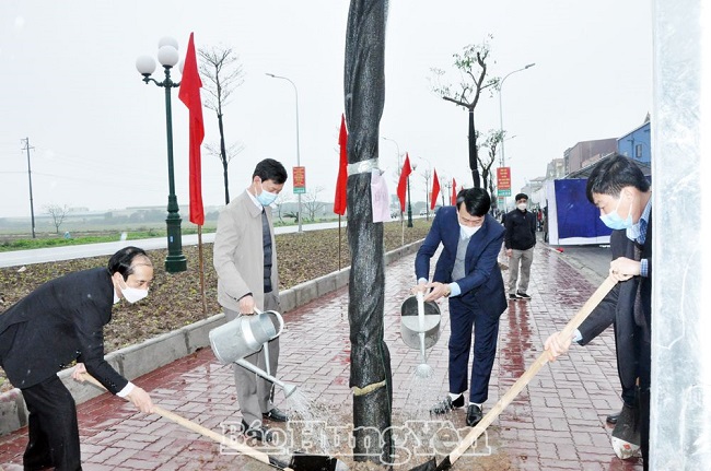 Các đại biểu trồng cây xanh tại điểm nút giao đường QL.39 với ĐT.379, xã Dân Tiến (Khoái Châu)