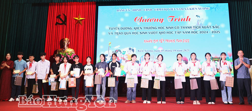 Trong các ngày 4-5/10, xã Kiến Xương tổ chức tuyên dương, khen thưởng cho 73 học sinh đạt thành tích học tập xuất sắc và 54 học sinh có hoàn cảnh khó khăn vươn lên trong học tập năm học 2024 – 2025; qua đó, góp phần lan tỏa phong trào khuyến học, khuyến tài và xây dựng xã hội học tập tại địa phương.