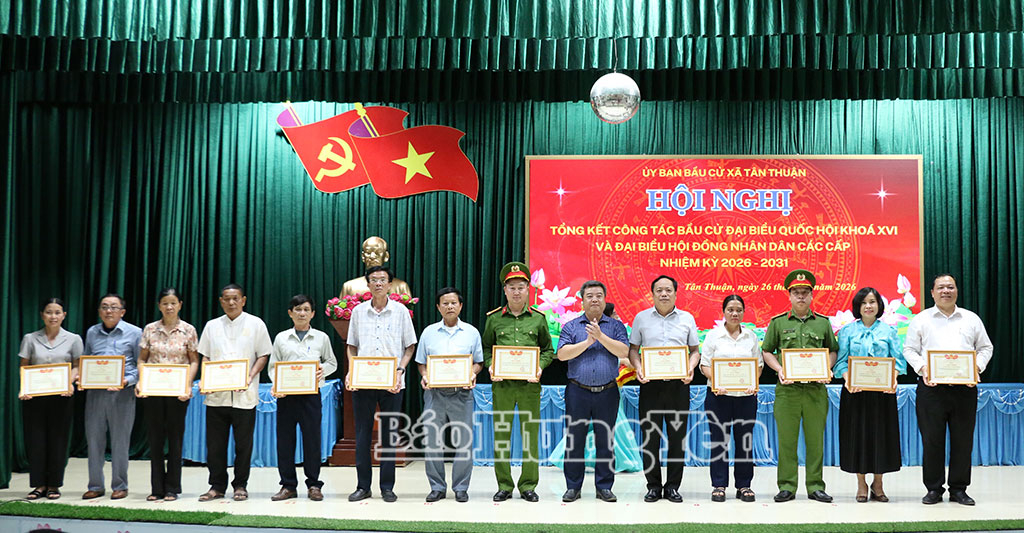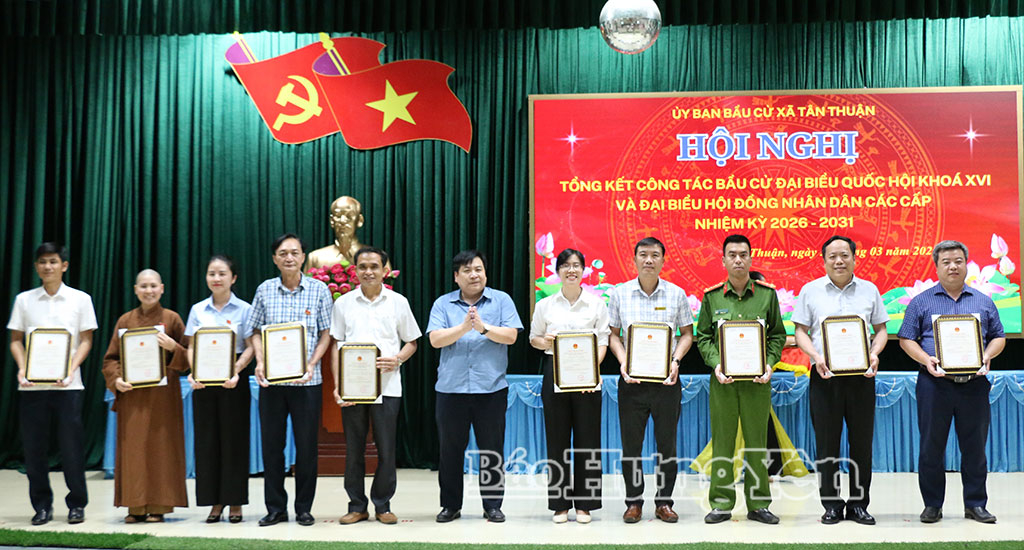 Tại hội nghị, lãnh đạo xã Tân Thuận trao giấy chứng nhận cho 21 ông, bà đã trúng cử đại biểu HĐND xã nhiệm kỳ 2026 - 2031; khen thưởng 52 tập thể, cá nhân có thành tích xuất sắc trong công tác bầu cử.
