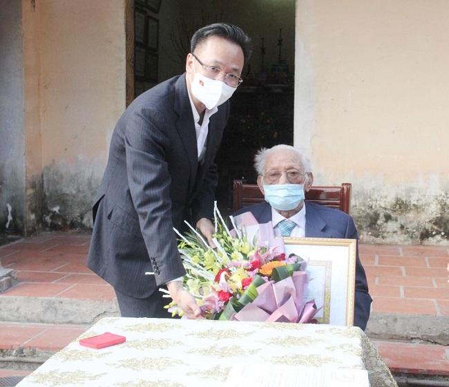 Đồng chí Trần Quốc Toản, Phó Bí thư Thường trực Tỉnh ủy, Chủ tịch HĐND tỉnh trao Huy hiệu 75 năm tuổi Đảng tặng đảng viên Lê Mạo, Đảng bộ thị trấn Như Quỳnh (Văn Lâm)