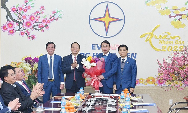 Đồng chí Phó Bí thư Tỉnh ủy, Chủ tịch UBND tỉnh Trần Quốc Văn tặng hoa và chúc Tết cán bộ, công nhân viên Công ty Điện lực Hưng Yên