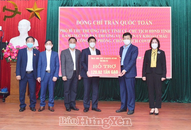 Trước đó, đồng chí Phó Bí thư Thường trực Tỉnh uỷ, Chủ tịch HĐND tỉnh Trần Quốc Toản đã trao quà của Tỉnh ủy, HĐND, UBND, Ủy ban MTTQ Việt Nam tỉnh gồm 120,9 tấn gạo hỗ trợ hộ nghèo, hộ cận nghèo; trao 555 triệu đồng hỗ trợ các tổ Covid cộng đồng và trao quà Tết cho đại diện các hộ nghèo, hộ cận nghèo trên địa bàn huyện Khoái Châu. Đồng chí yêu cầu huyện Khoái Châu thực hiện nghiêm các giải pháp phòng, chống dịch Covid-19 trước, trong và sau Tết Nguyên đán.