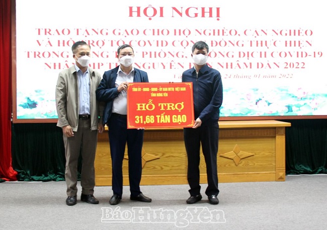 * Ngày 24.1, các đồng chí: Đặng Ngọc Quỳnh, Ủy viên Ban Thường vụ Tỉnh ủy, Phó Chủ tịch Thường trực UBND tỉnh; Quách Thị Hương, Ủy viên Ban Thường vụ Tỉnh ủy, Trưởng ban Dân vận Tỉnh ủy, Chủ tịch Ủy ban MTTQ Việt Nam tỉnh trao gạo của tỉnh hỗ trợ người thuộc hộ nghèo, hộ cận nghèo và trao tiền của tỉnh hỗ trợ tổ Covid cộng đồng trên địa bàn huyện Phù Cừ. Trong đợt này, huyện Phù Cừ có 941 hộ nghèo với 1.672 người và 1.337 hộ cận nghèo với 2.993 người được hỗ trợ, tổng số gạo là 46,65 tấn; trao 270 triệu đồng của tỉnh hỗ trợ các tổ Covid cộng đồng trên địa bàn huyện.