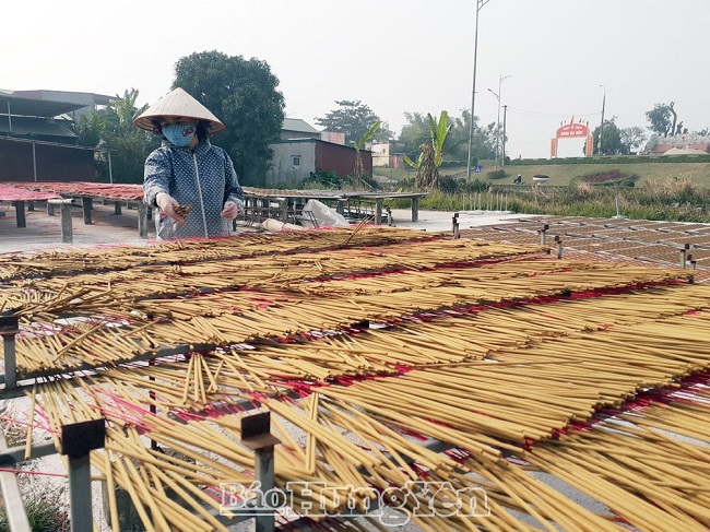 Trên khắp các nẻo đường vào làng, đâu đâu cũng thấy những dàn hương vòng, hương nén… đang được phơi nắng. Không khí làng hương vào những ngày chuẩn bị vụ tết thật hối hả. Bà Hoàng Thị Xinh đã hơn 20 năm làm hương, đứng trước chiếc máy nhỏ, tay bà cứ thoăn thoắt, thoăn thoắt không ngơi nghỉ, những nén hương thành phẩm nhanh chóng đầy khay với tăm màu đỏ, sắc hương nâu trầm, tỏa hương thơm dịu nhẹ. Bà Xinh chia sẻ: Vào mùa này, hương sản xuất ra bao nhiêu bán hết bấy nhiêu. Năm nay lại được thời tiết ủng hộ, mẻ hương nào cũng được nắng, chất lượng hương thành phẩm rất tốt. Việc xuất bán ngoại tỉnh cũng thuận lợi, gia đình tôi ai cũng phấn khởi trước cái tết đủ đầy, ấm no.