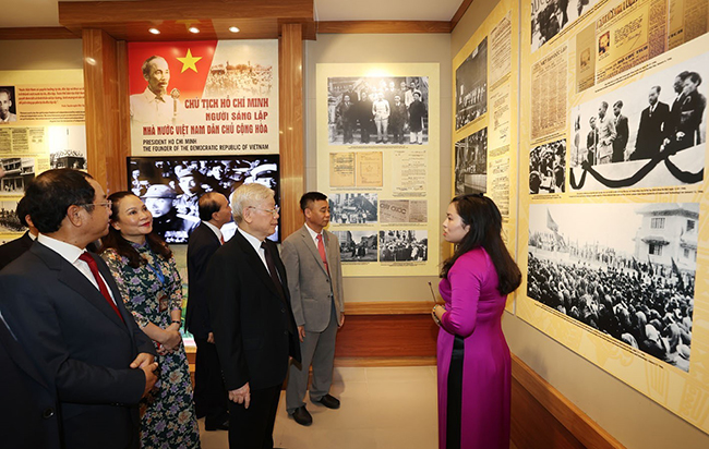 Tổng Bí thư, Chủ tịch nước Nguyễn Phú Trọng thăm phòng trưng bày “Chủ tịch Hồ Chí Minh - Người sáng lập Nhà nước Việt Nam Dân chủ Cộng hòa”, ngày 1-9-2020 _Ảnh: TTXVN