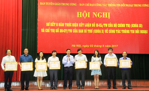 Tại Hội nghị, Ban Tuyên giáo Trung ương đã tặng Bằng khen cho 8 tập thể và 6 cá nhân đã có thành tích xuất sắc trong quá trình triển khai thực hiện công tác thông tin đối ngoại giai đoạn 2011 – 2020./.