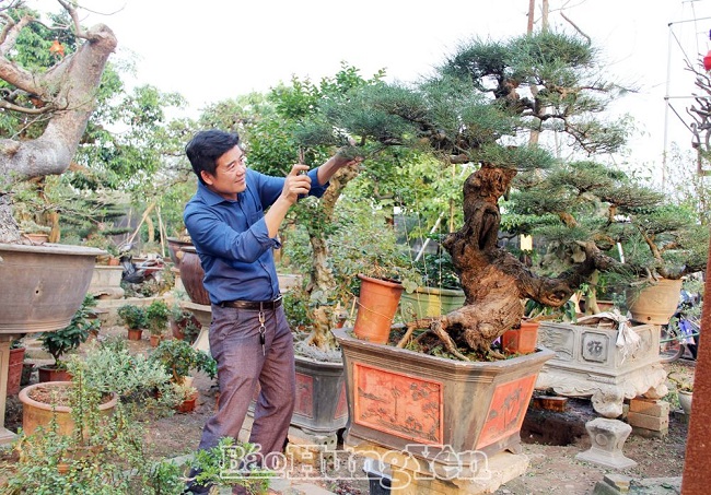 Uốn tỉa cây cảnh bon sai. (Ảnh chụp tại xã Phụng Công, Văn Giang)