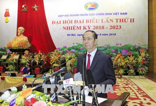 Chủ tịch nước Trần Đại Quang đề nghị cấp ủy Đảng, chính quyền các cấp quan tâm lãnh đạo, chỉ đạo, tạo điều kiện thuận lợi về vật chất và tinh thần để hoạt động của các cấp Hội Cựu chiến binh Việt Nam, Hiệp hội Doanh nhân Cựu chiến binh Việt Nam ngày càng có hiệu quả thiết thực. Chủ tịch nước mong muốn Hiệp hội Doanh nhân Cựu chiến binh Việt Nam tiếp tục giành được những kết quả, thành tích to lớn hơn nữa, tích cực góp phần cùng toàn Đảng, toàn dân và toàn quân thực hiện thắng lợi Nghị quyết Đại hội lần thứ XII của Đảng, xây dựng một nước Việt Nam dân giàu, nước mạnh, dân chủ, công bằng, văn minh, vững bước đi lên chủ nghĩa xã hội./.
