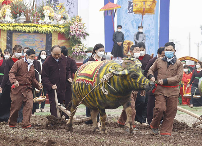 Chủ tịch nước Nguyễn Xuân Phúc xuống đồng cày ruộng đầu năm mới. (Ảnh: TTXVN)