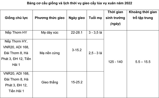 Vụ xuân 2022, ngành nông nghiệp khuyến cáo nông dân tập trung gieo cấy lúa sau Tết âm lịch là chính. Tùy từng địa phương để bố trí linh hoạt diện tích gieo cấy phù hợp; thời vụ gieo cấy cần bảo đảm lúa phân hóa đòng và trỗ gặp điều kiện thời tiết thuận lợi (trỗ trước ngày 20.5.2022). Mỗi huyện, thành phố, thị xã lựa chọn từ 3 đến 4 giống chủ lực để chỉ đạo gieo cấy, gồm các giống: Nếp Thơm Hưng Yên, VNR20, Đài Thơm 8, ADI168, Hà Phát 3. Các địa phương có thể lựa chọn mở rộng diện tích gieo cấy các giống có triển vọng (đã khảo nghiệm, trình diễn cho kết quả tốt từ 2 vụ trở lên) như các giống lúa: VNR10, Tiền Hải 1, ĐH12, BQ, BT09, TBR89, tổ chức gieo cấy gọn vùng và tuân thủ quy trình kỹ thuật canh tác của từng giống. Thay giống lúa Bắc thơm số 7 bằng các giống như: Nếp thơm Hưng Yên, Đài thơm 8, BT09, Tiền Hải 1. Mở rộng tối đa diện tích gieo cấy bằng mạ non trên nền đất cứng, có áp dụng biện pháp che phủ tránh rét; tăng cường áp dụng cơ giới hóa trong gieo cấy để đẩy nhanh tiến độ gieo cấy. Chỉ gieo thẳng khi điều kiện thời tiết ấm, gieo mạ dày xúc để cấy chân vàn thấp, chân ruộng trũng không chủ động điều tiết nước, cấy khi mạ được 3 - 3,5 lá thật.