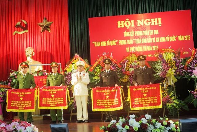 Đồng chí Nguyễn Văn Phóng, Phó Bí thư Tỉnh ủy, Chủ tịch UBND tỉnh trao Cờ dẫn đầu phong trào thi đua năm 2015 cho 3 tập thể có thành tích xuất sắc trong phong trào thi đua “Vì an ninh Tổ quốc”, phong trào “Toàn dân bảo vệ an ninh Tổ quốc” năm 2015