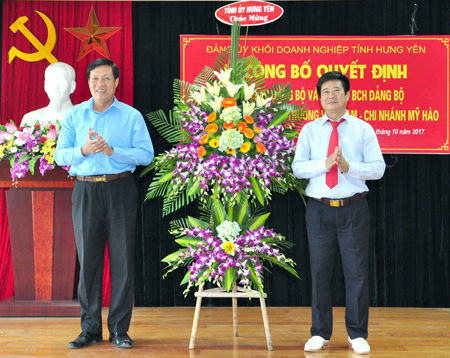 Phát biểu tại buổi lễ, Phó Bí thư Thường trực Tỉnh ủy Đỗ Xuân Tuyên yêu cầu: Đảng bộ Ngân hàng TMCP Công thương Việt Nam - Chi nhánh Mỹ Hào tiếp tục thực hiện tốt vai trò, nhiệm vụ của tổ chức cơ sở đảng theo Điều lệ Đảng, hướng dẫn của cấp ủy cấp trên; triển khai thực hiện tốt các chủ trương của Đảng, chính sách, pháp luật của Nhà nước; kịp thời xây dựng quy chế làm việc, phân công nhiệm vụ, tổ chức sinh hoạt đúng quy định, thiết thực, hiệu quả, sát với thực tiễn kinh doanh của đơn vị; tiếp tục làm tốt công tác phát triển đảng viên mới; tạo điều kiện cho tổ chức công đoàn, đoàn thanh niên hoạt động; quan tâm, chăm lo đời sống của cán bộ, đảng viên và người lao động. Đảng ủy Khối Doanh nghiệp tỉnh tiếp tục đẩy mạnh việc thành lập các tổ chức đảng trong doanh nghiệp trên địa bàn tỉnh.