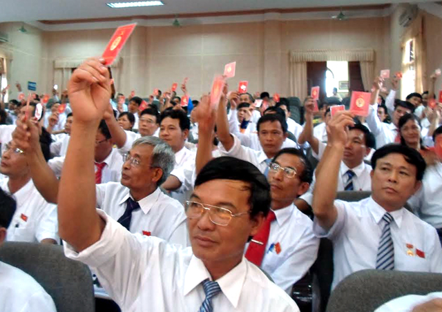 Các đại biểu biểu quyết thông qua Báo cáo chính trị của Ban Chấp hành Đảng bộ huyện khóa XXIV