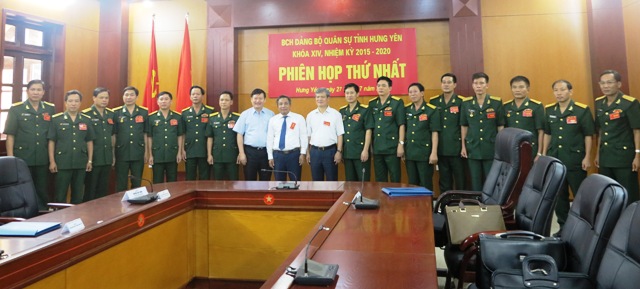 Các đồng chí lãnh đạo tỉnh chụp ảnh lưu niệm cùng Ban chấp hành Đảng bộ Quân sự tỉnh khóa XIV, nhiệm kỳ 2015 - 2020