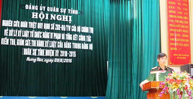 Ngày 9/6, Đảng ủy Quân sự tỉnh đã tổ chức quán triệt, triển khai thực hiện Quy định số 263 – QĐ/TW của Bộ Chính trị về xử lý kỷ luật tổ chức đảng vi phạm và tổng kết công tác kiểm tra, giám sát, thi hành kỷ luật của Đảng nhiệm kỳ 2010 – 2015 trong Đảng bộ và lực lượng vũ trang tỉnh.