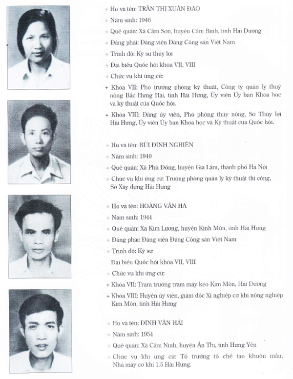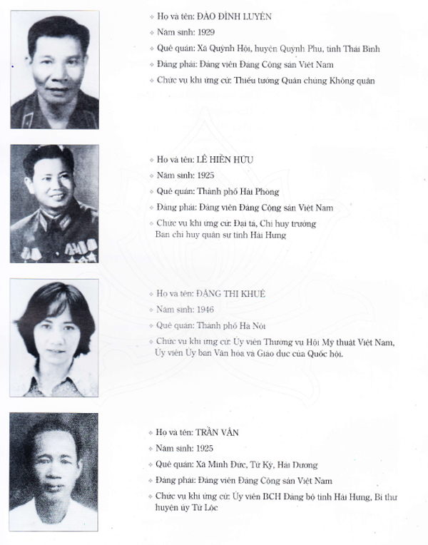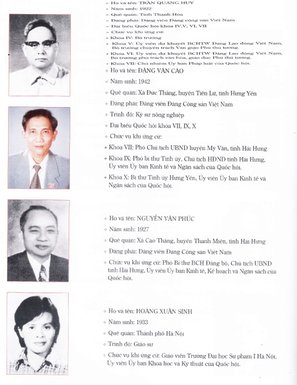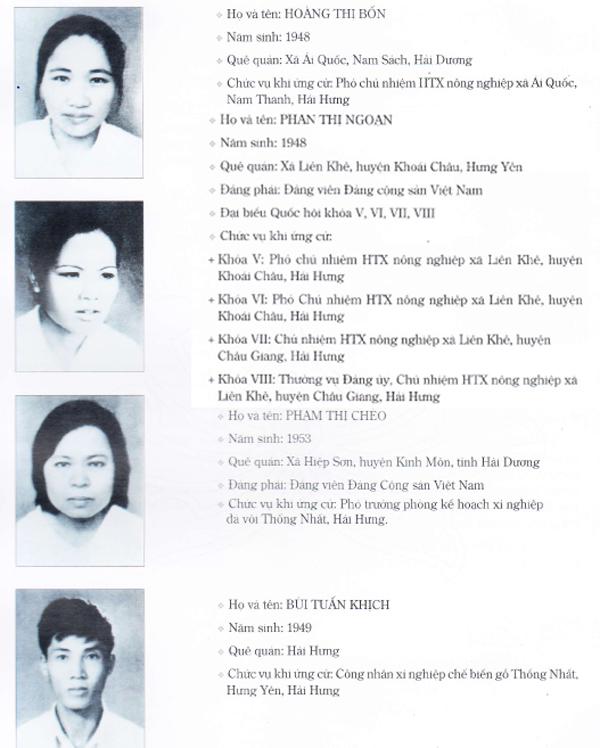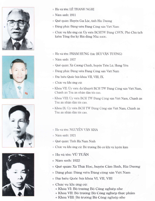 1. Lê Thanh Nghị; 2. Phạm Hưng tức Bùi Văn Tường (Đại biểu các khóa VII, VIII, IX); 3. Phạm Văn Kha; 4. Vũ Tuân; 5. Trần Quang Huy; 6. Đặng Văn Cảo (Đại biểu các khóa VII, IX,X); 7. Nguyễn Văn Phúc; 8. Hoàng Xuân Sính; 9. Đào Đình Luyện; 10. Lê Hiền Hữu; 11. Đặng Thị Khuê; 12. Trần Vân; 13. Trần Thị Xuân Đào; 14. Bùi Đình Nghiên; 15. Hoàng Văn Ha; 16. Đinh Văn Hải; 17. Hoàng Thị Bốn; 18. Phan Thị Ngoạn; 19. Phạm Thị Chèo; 20. Bùi Tuấn Khịch.