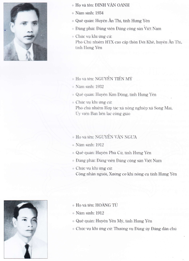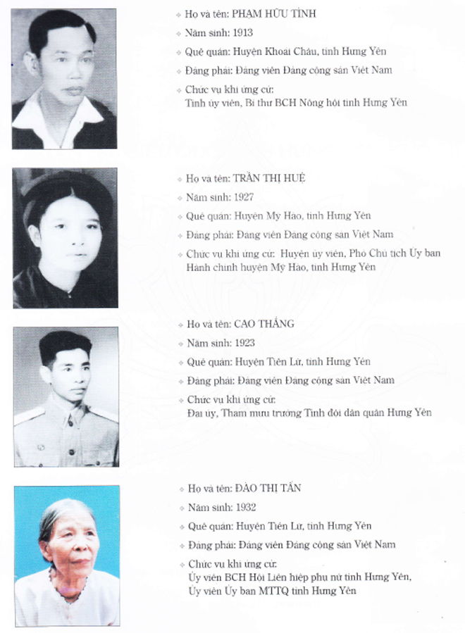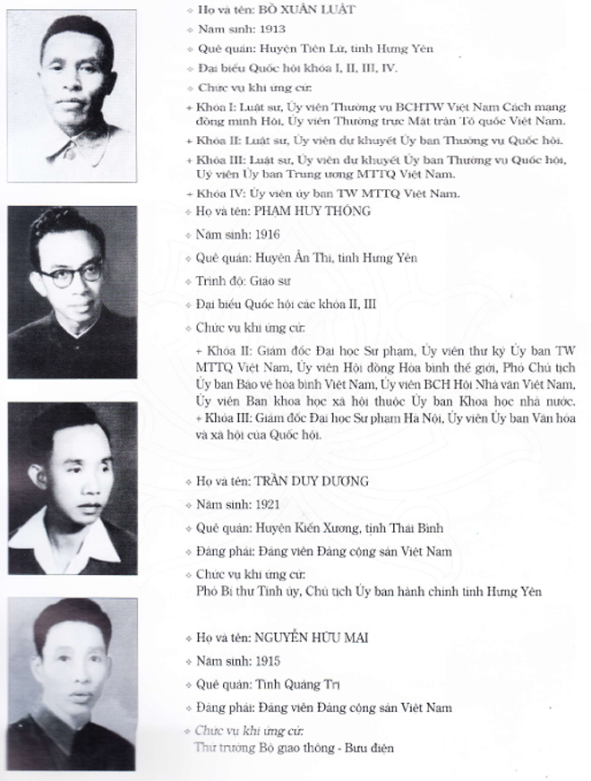 1. Bồ Xuân Luật; 2. Phạm Huy Thông; 3. Trần Duy Khương; 4. Nguyễn Hữu Mai; 5. Phạm Hữu Tình; 6. Trần Thị Huệ; 7. Cao Thắng; 8. Đào Thị Tấn; 9. Đinh Văn Oanh; 10. Nguyễn Tiến Mỹ; 11. Nguyễn Văn Ngưa; 12. Hoàng Tú