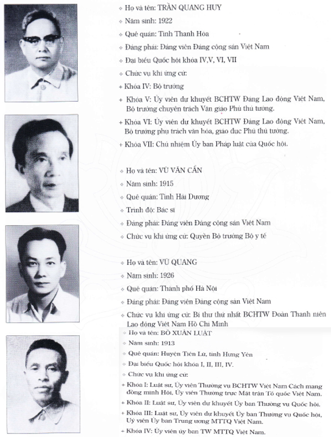 (Từ 1.3.1968 đến 1.1.1997 hai tỉnh Hưng Yên và Hải Dương hợp nhất thành tỉnh Hải Hưng, do vậy từ khóa IV đến khóa IX là Đoàn đại biểu Quốc hội tỉnh Hải Hưng gồm 32 vị ) 1. Trần Quang Huy; 2. Vũ Văn Cẩn; 3. Vũ Quang; 4. Bồ Xuân Luật; 5. Lê Quý Quỳnh (tức Vương Văn Thành); 6. Nguyễn Hoài Bắc; 7. Trần Tống; 8. Hòa thượng Thích Tâm An; 9. Lương Đình Của; 10. Lê Minh Đức; 11. Đặng Tính; 12. Trần Thị Thí; 13. Phạm Thị Vách; 14. Hoàng Thị Thục; 15. Nguyễn Đình Long; 16. Nguyễn Thị Mười; 17. Phạm Thị Hải; 18. Lê Xuân Đài; 19. Phan Thị Đức; 20. Phạm Văn Lục; 21. Nguyễn Hữu Hạ; 22. Hồ Thị Nhỡ; 23. Nguyễn Văn Sáu; 24. Ngô Thị Thanh Lịch; 25. Lê Văn Nổ; 26. Nguyễn Văn Thơm; 27. Nguyễn Thị Liên; 28. Nguyễn Thị Tân; 29. Hoàng Năng Thân; 30. Nguyễn Thị Ắt; 31. Nguyễn Thị Toa; 32. Trần Đức Quang.