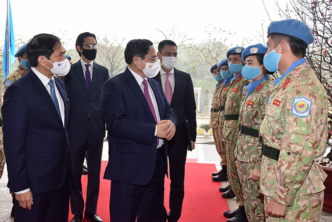 Ủy viên Bộ Chính trị, Thủ tướng Chính phủ Phạm Minh Chính thăm hỏi, chúc mừng các cán bộ, chiến sĩ tham gia lực lượng giữ gìn hòa bình của Liên Hợp Quốc đã hoàn thành nhiệm vụ tại Hội nghị tổng kết hai năm Việt Nam đảm nhiệm cương vị Ủy viên không thường trực Hội đồng Bảo an Liên hợp quốc nhiệm kỳ 2020 - 2021, do Bộ Ngoại giao tổ chức _Ảnh: VGP