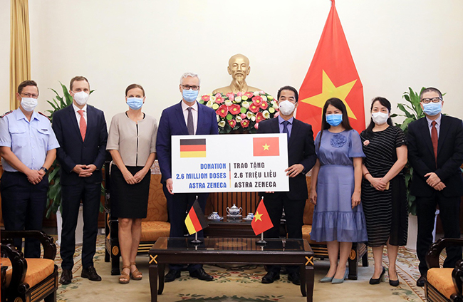 Ngoại giao y tế và ngoại giao vắc-xin là một trong những điểm sáng trong thành tựu đối ngoại năm 2021 (Trong ảnh: Bộ Ngoại giao tổ chức lễ tiếp nhận 2,6 triệu liều vaccine AstraZeneca do Cộng hòa liên bang Đức hỗ trợ Việt Nam phòng, chống dịch COVID-19) _Ảnh: TTXVN