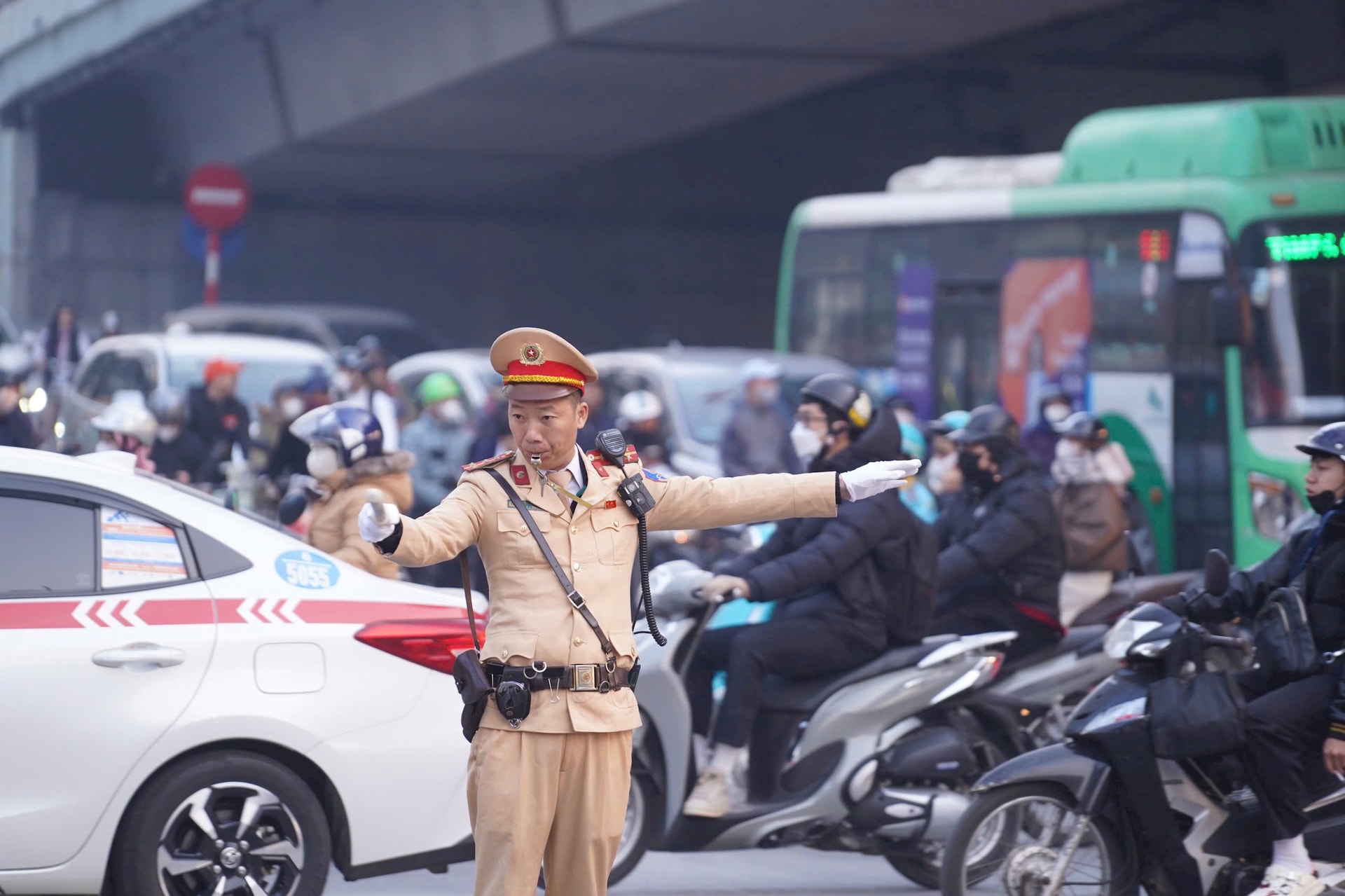 Lực lượng Cảnh sát giao thông phân luồng tại nút giao Kim Mã - Đào Tấn. Ảnh: MH
