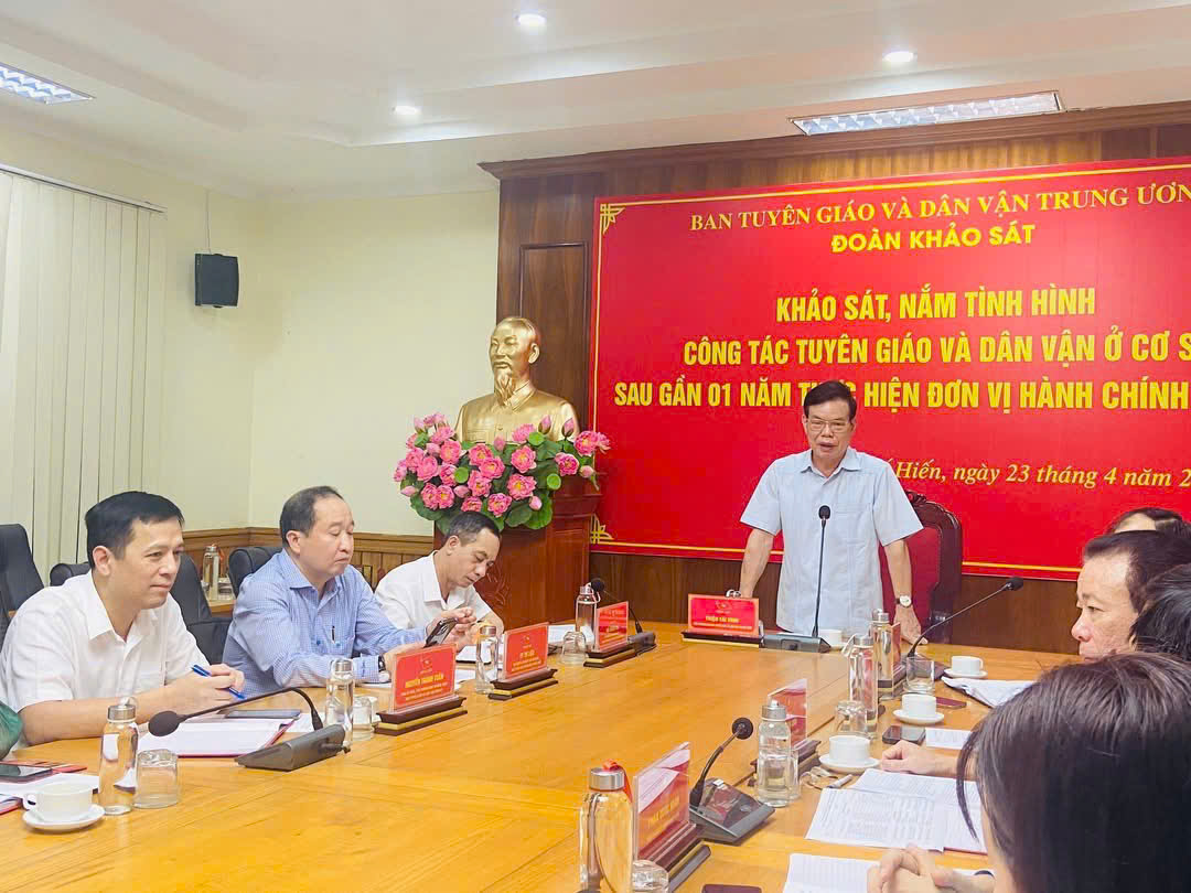 Ngày 23/4/2026, Đoàn khảo sát của Ban Tuyên giáo và Dân vận Trung ương do đồng chí Triệu Tài Vinh, Phó Trưởng Ban Tuyên giáo và Dân vận Trung ương làm Trưởng đoàn đã làm việc tại tỉnh Hưng Yên nhằm khảo sát, nắm tình hình công tác tuyên giáo và dân vận ở cơ sở sau gần 01 năm thực hiện mô hình chính quyền địa phương hai cấp. Tham gia Đoàn có 12 đồng chí là thành viên Đoàn công tác.