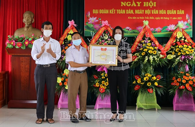 Đồng chí Quách Thị Hương, Ủy viên Ban Thường vụ Tỉnh ủy, Trưởng ban Dân vận Tỉnh ủy, Chủ tịch Ủy ban MTTQ Việt Nam tỉnh trao bằng khen tặng khu dân cư thôn Trắc Điền đã có thành tích xuất sắc trong thực hiện các cuộc vận động, phong trào thi đua yêu nước năm 2021