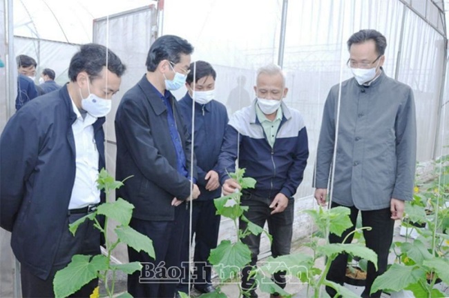 Đồng chí Bí thư Tỉnh ủy Nguyễn Hữu Nghĩa thăm mô hình sản xuất dưa chuột trong nhà lưới của Hợp tác xã sản xuất cung ứng rau quả và cây dược liệu An Thịnh Phát tại xã Tống Trân (Phù Cừ)