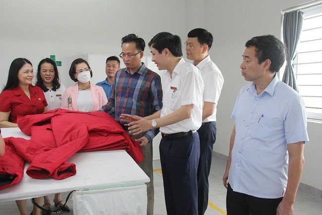 Đồng chí Bí thư Tỉnh ủy Nguyễn Hữu Nghĩa và các đại biểu thăm dây chuyền sản xuất tại Công ty cổ phần May và Dịch vụ Hưng Long