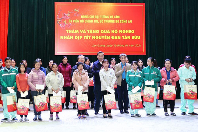 Ngày 19.1, tại Hội trường Huyện ủy Văn Giang, đồng chí Đại tướng Tô Lâm, Ủy viên Bộ Chính trị, Bộ trưởng Bộ Công an đã trao quà tặng gia đình chính sách, hộ nghèo, công nhân lao động có hoàn cảnh khó khăn trên địa bàn tỉnh nhân dịp Tết Nguyên đán Tân Sửu 2021. Cùng đi có các đồng chí: Đỗ Tiến Sỹ, Ủy viên BCH Trung ương Đảng, Bí thư Tỉnh ủy, Trưởng đoàn Đại biểu Quốc hội tỉnh; Trương Thị Ngọc Ánh, Phó Chủ tịch Ủy ban Trung ương MTTQ Việt Nam; Trần Văn Thuật, Phó Chủ tịch Tổng Liên đoàn Lao động Việt Nam; Nguyễn Duy Hưng, Phó Bí thư Thường trực Tỉnh ủy; Trần Quốc Toản, Phó Bí thư Tỉnh ủy, Chủ tịch HĐND tỉnh; Trần Quốc Văn, Phó Bí thư Tỉnh ủy, Chủ tịch UBND tỉnh; các đồng chí trong Ban Thường vụ Tỉnh ủy…