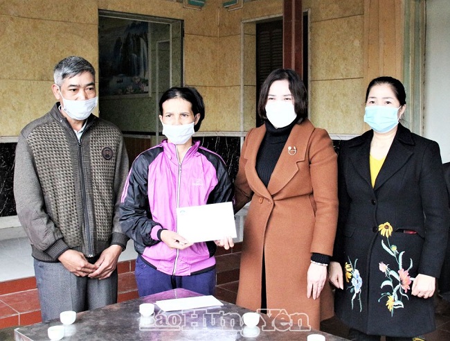 Đồng chí Quách Thị Hương, Uỷ viên Ban Thường vụ Tỉnh ủy, Trưởng ban Dân vận Tỉnh ủy, Chủ tịch Uỷ ban MTTQ Việt Nam tỉnh trao tiền hỗ trợ cho thân nhân chị Nguyễn Thị Tươi, ở xã Ngọc Thanh