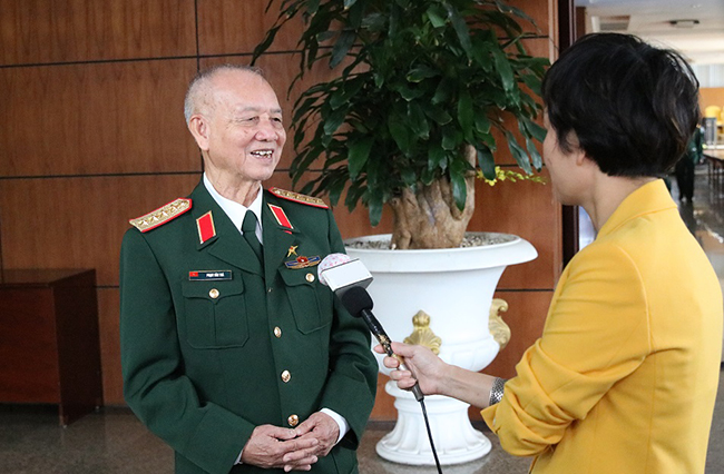 Đại tướng Phạm Văn Trà, nguyên Ủy viên Bộ Chính trị, nguyên Bộ trưởng Bộ Quốc phòng trao đổi với phóng viên báo chí. (Ảnh: Thế Hoàng).