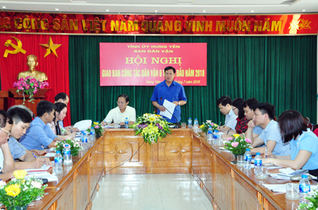 Ngày 23.7, Ban Dân vận Tỉnh ủy tổ chức hội nghị giao ban công tác dân vận 6 tháng đầu năm, triển khai nhiệm vụ trọng tâm 6 tháng cuối năm 2018. Đồng chí Đỗ Xuân Tuyên, Phó Bí thư Thường trực Tỉnh ủy, Chủ tịch HĐND tỉnh dự. Cùng dự có các đồng chí trong Ban Thường vụ Tỉnh ủy.