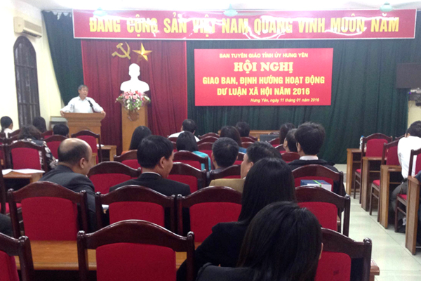 Chiều 11/01/2016, tại Hội trường Nhà làm việc các ban xây dựng Đảng tỉnh, Ban Tuyên giáo Tỉnh ủy tổ chức hội nghị giao ban, định hướng hoạt động dư luận xã hội năm 2016. Đồng chí Nguyễn Tiến Thuyết, Phó Trưởng ban Thường trực, Ban Tuyên giáo Tỉnh ủy chủ trì hội nghị. Dự hội nghị có các đồng chí là trưởng ban tuyên giáo các huyện ủy, thành ủy, đảng ủy trực thuộc Tỉnh ủy; cộng tác viên dư luận xã hội cấp tỉnh và cấp huyện.