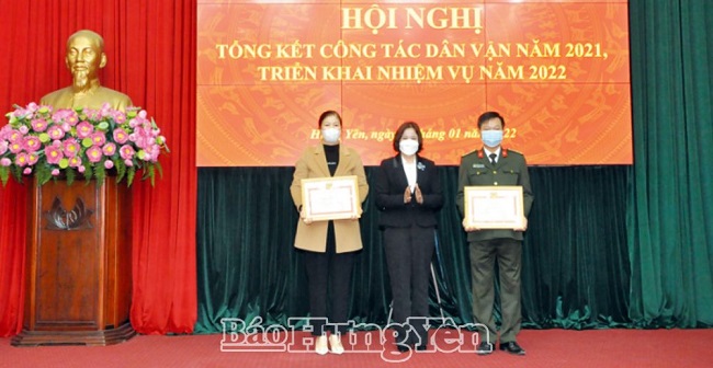 Đồng chí Quách Thị Hương, Uỷ viên Ban Thường vụ Tỉnh uỷ, Trưởng ban Dân vận Tỉnh uỷ, Chủ tịch Uỷ ban MTTQ Việt Nam tỉnh trao giấy khen của Ban Dân vận Tỉnh uỷ tặng các tập thể có thành tích xuất sắc trong công tác dân vận năm 2021