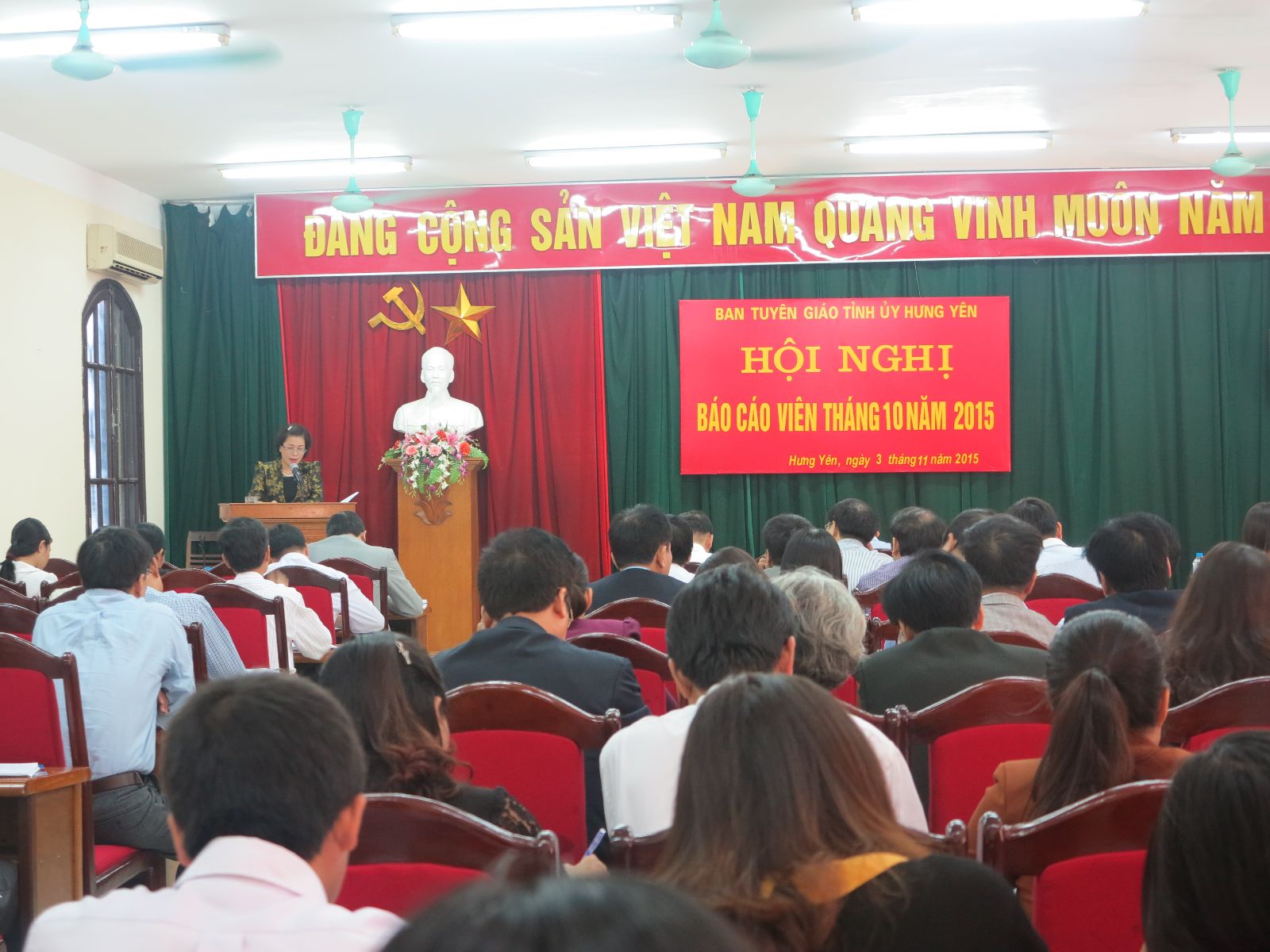 Sáng ngày 3/11, tại Hội trường các Ban đảng Tỉnh ủy, Ban Tuyên giáo Tỉnh ủy tổ chức Hội nghị báo cáo viên tháng 10 năm 2015. Các đồng chí: Trần Thị Thanh Thủy, Ủy viên Ban Thường vụ Tỉnh ủy, Phó Trưởng ban Tuyên giáo Tỉnh ủy; Nguyễn Tiến Thuyết, Phó Trưởng ban Thường trực Ban Tuyên giáo Tỉnh ủy chủ trì Hội nghị.