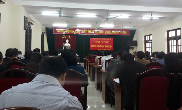 Sáng ngày 26/12/2016, tại Nhà làm việc các ban Đảng tỉnh, Ban Tuyên giáo Tỉnh ủy tổ chức Hội nghị Báo cáo viên tháng 12/2016. Dự Hội nghị có các đồng chí: Đỗ Hữu Nhân, TUV, Phó Trưởng Ban Thường trực Ban Tuyên giáo Tỉnh ủy; Nguyễn Tiến Thuyết, Phó Trưởng Ban Tuyên giáo Tỉnh ủy.