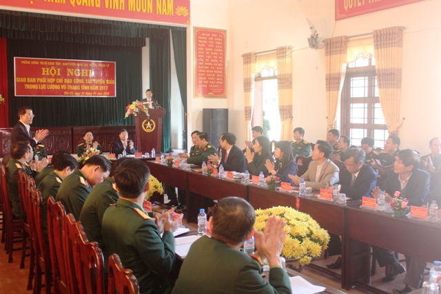 Trong năm 2017, công tác tuyên giáo giữa Phòng Chính trị-Bộ CHQS tỉnh với Ban Tuyên giáo các huyện ủy, thành ủy đã đảm bảo tốt các nội dung, chương trình theo quy chế đã đề ra. Nổi bật là phối hợp chỉ đạo làm tốt công tác giáo dục chính trị tư tưởng, xây dựng bản lĩnh chính trị vững vàng cho cán bộ, chiến sỹ lực lượng vũ trang và nâng cao nhận thức về nhiệm vụ quốc phòng cho các tầng lớp nhân dân; nâng cao chất lượng chính trị cho lực lượng dân quân tự vệ, lực lượng dự bị động viên và bồi dưỡng kiến thức quốc phòng, an ninh cho các đối tượng; làm tốt công tác tuyên truyền, với chủ đề: “Nâng cao chất lượng công tác tuyên truyền thực hiện nhiệm vụ quân sự, quốc phòng, ngăn chặn, đẩy lùi suy thoái về tư tưởng chính trị, đạo đức, lối sống, những biểu hiện “tự diễn biến”, “ tự chuyển hóa” trong Lực lượng Vũ trang tỉnh”. Công tác phối hợp đã góp phần quan trọng trong giữ vững an ninh chính trị, trật tự an toàn xã hội, hoàn thành nhiệm vụ quốc phòng, quân sự, phát triển kinh tế xã hội của địa phương.