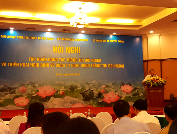 Từ ngày 04 đến 05/11/2015, tại Hội trường nhà E, Nhà khách La Thành, số 218 Đội Cấn, Ba Đình, Hà Nội, Ban Chỉ đạo Trung ương về Công tác thông tin đối ngoại và Ban Tuyên giáo Trung ương phối hợp với Bộ Thông tin và Truyền thông tổ chức "Hội nghị tập huấn về công tác thông tin đối ngoại và triển khai Nghị định về quản lý hoạt động thông tin đối ngoại" cho đội ngũ cán bộ chuyên trách, phóng viên, biên tập viên báo chí của 31 tỉnh, thành phố phía Bắc.