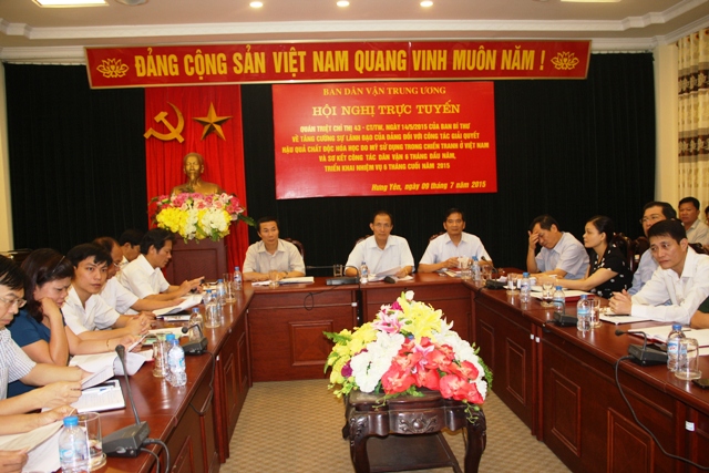 Ngày 09/7, Ban Dân vận Trung ương tổ chức Hội nghị trực tuyến quán triệt Chỉ thị số 43 - CT/TW ngày 14/5/2015 của Ban Bí thư Trung ương Đảng (khóa XI) “về tăng cường sự lãnh đạo của Đảng đối với công tác giải quyết hậu quả chất độc hóa học do Mỹ sử dụng trong chiến tranh ở Việt Nam”; sơ kết công tác dân vận 6 tháng đầu năm, triển khai nhiệm vụ 6 tháng cuối năm 2015 tại 63 điểm cầu các tỉnh, thành phố và 01 điểm cầu trung tâm tại Ban Dân vận Trung ương. Đồng chí Lê Hồng Anh, Ủy viên Bộ Chính trị, Thường trực Ban Bí thư và đồng chí Hà Thị Khiết, Bí thư Trung ương Đảng, Trưởng Ban Dân vận Trung ương chủ trì hội nghị.