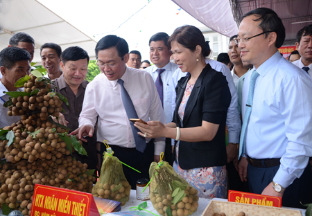 Trân trọng tiếp thu ý kiến chỉ đạo của Phó Thủ tướng Chính phủ Vương Đình Huệ, đồng chí Nguyễn Văn Phóng, Phó Bí thư Tỉnh ủy, Chủ tịch UBND tỉnh khẳng định: Trong thời gian tới, tỉnh sẽ thực hiện có hiệu quả Nghị quyết Trung ương 7 khóa X về nông nghiệp, nông dân, nông thôn. Đẩy mạnh sản xuất những sản phẩm nông nghiệp chủ lực của tỉnh có giá trị cao, phát triển nhanh các hình thức tổ chức sản xuất, tăng cường liên kết sản xuất, sản xuất sạch theo tiêu chuẩn VietGap; kết nối cung - cầu; xây dựng nhãn hiệu, thương hiệu nông sản để thúc đẩy tiêu thụ sản phẩm nông nghiệp, đặc biệt là đối với cây nhãn góp phần nâng cao hiệu quả sản xuất, thu nhập và đời sống của người dân.