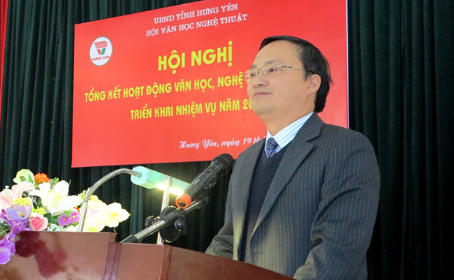Phát biểu chỉ đạo Hội nghị, đồng chí Đỗ Tiến Sỹ- Phó Bí thư Tỉnh ủy, Chủ tịch Hội VHNT đã biểu dương các thành tích mà cán bộ, hội viên Hội VHNT tỉnh đã đạt được trong năm qua. Theo đồng chí, năm 2014, Hội đã thể hiện được tinh thần đoàn kết- đổi mới và phát triển. Biểu hiện cụ thể là, trong năm, hoạt động của Hội có kỷ cương, thực hiện nghiêm các quy chế, quy định của Hội. Các hoạt động tổ chức Trại sáng tác, hỗ trợ sáng tạo, công bố đi vào nề nếp, các cuộc thi do Hội phát động được nhiều tác giả tham gia, bài vở có chất lượng cao; tạp chí Phố Hiến đã mạnh dạn đổi mới, hình thức đẹp. Về tổ chức, trong năm 2014, Hội đã kết nạp được 14 hội viên, trong đó có nhiều hội viên trẻ, có năng lực sáng tạo. Đồng chí Phó Bí thư Tỉnh ủy cũng đề nghị, lãnh đạo, hội viên cần nghiêm túc nhìn nhận các khuyết điểm, hạn chế của Hội để đoàn kết khắc phục, hoàn thành tốt nhiệm vụ năm 2015.